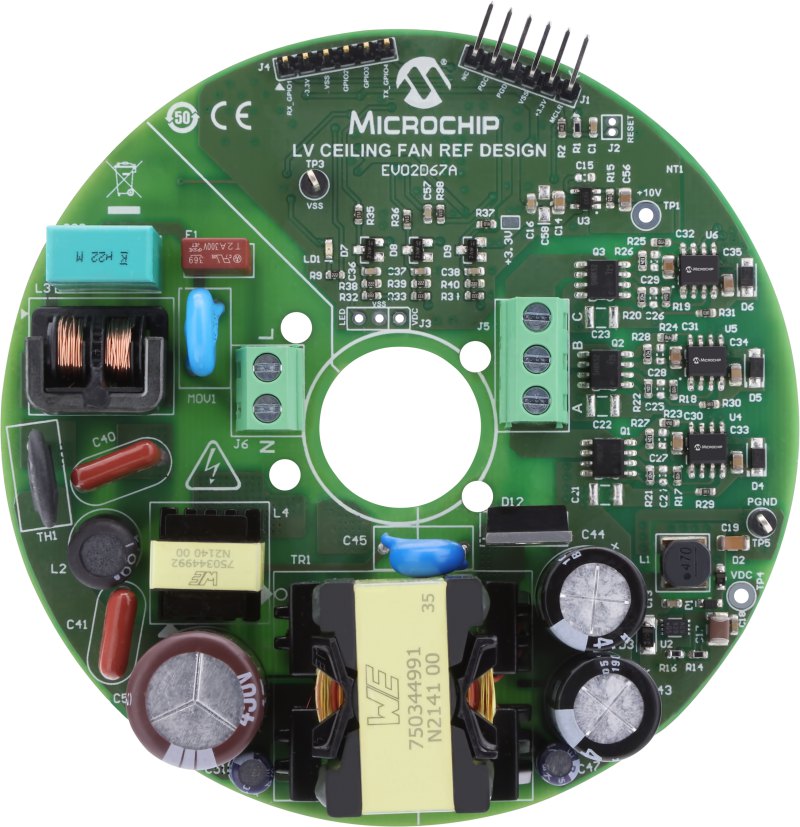 Para minimizar el consumo de energía en los hogares, los ventiladores de techo y otros ventiladores domésticos están migrando de motores de inducción de CA monofásicos (ACIM) grandes y pesados a motores de CC trifásicos sin escobillas (BLDC) o motores síncronos de imanes permanentes más pequeños, más livianos y más eficientes ( PMSM). ) que ofrecen mayor densidad de potencia. Microchip ha lanzado un diseño de referencia de ventilador de techo de bajo voltaje que ofrece una solución rentable y de bajo consumo para un ventilador PMSM de bajo voltaje. El diseño puede hacer funcionar un ventilador de techo a 300 revoluciones por minuto (RPM) mientras consume aproximadamente 17,5 W de potencia, lo que equivale a la potencia requerida por dos bombillas de diodo emisor de luz (LED) de aproximadamente 60 vatios. Este diseño de referencia controla un motor de ventilador de techo PMSM/BLDC trifásico de bajo voltaje. La placa funciona con la alimentación de CA de entrada en el rango de voltaje de 90-265 VCA. El diseño puede impulsar motores BLDC/PMSM con una potencia de hasta 40 W.